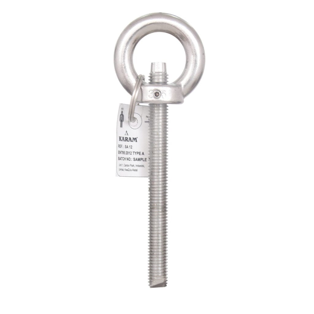 - Um sistema de fixação de ponto de ancoragem compreende um parafuso de olhal de aço inoxidável de 110 mm de comprimento para fixação em concreto.