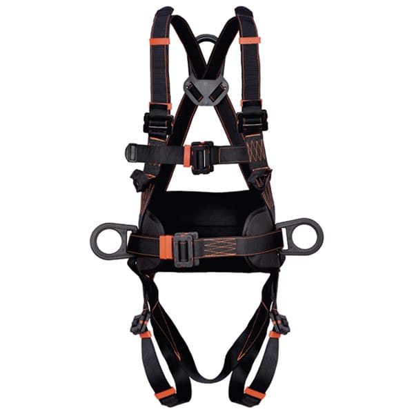 Elementos de fixação: 2 laços têxteis de fixação no peito e um anel em D de fixação dorsal não condutivo para proteção contra quedas. 2 anéis em D laterais não condutivos na altura da cintura para posicionamento de trabalho.