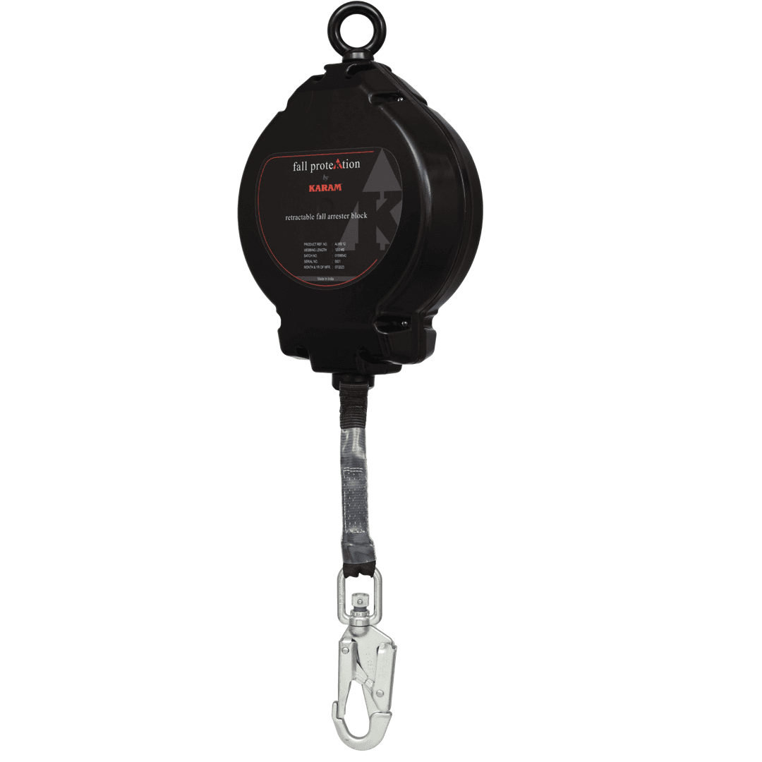 KARAM também oferece uma variedade de blocos retráteis em invólucro de alumínio, com talabarte de corda de aço galvanizado usado na indústria e talabarte de correia de 25 mm.