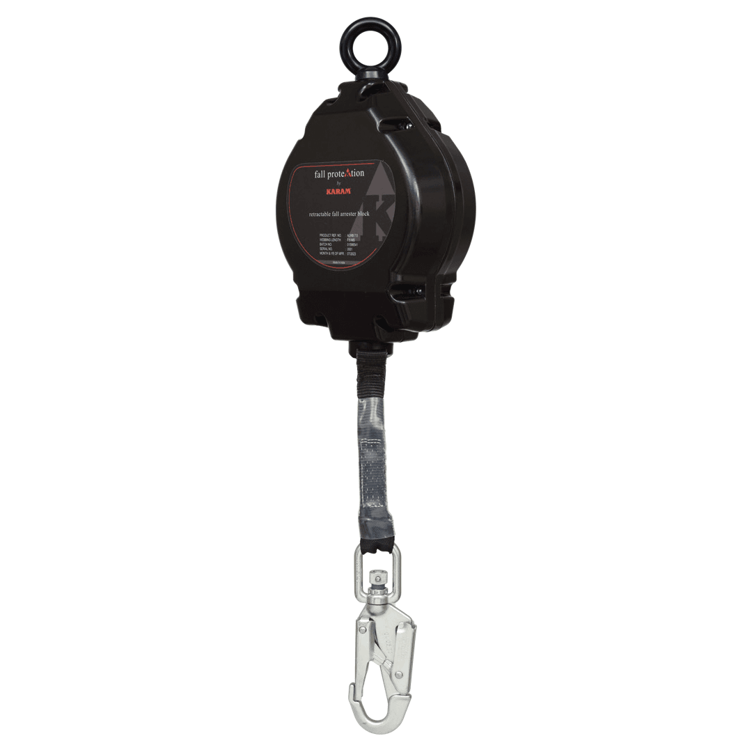 KARAM também oferece uma variedade de blocos retráteis em invólucro de alumínio, com talabarte de corda de aço galvanizado usado na indústria e talabarte de correia de 25 mm.