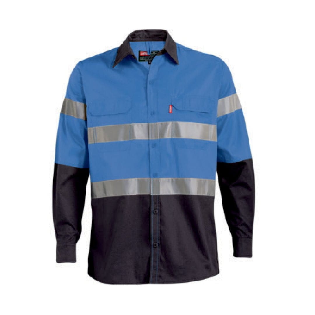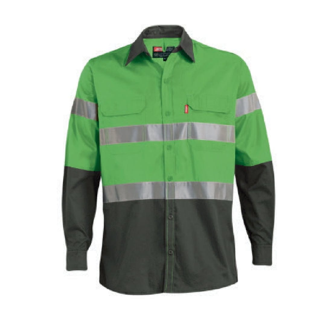 Camisa de trabalho de manga comprida Versatex Lite com fita refletiva para visibilidade, pregas duplas nas costas e botões na frente. Possui bainha extra longa, costura tripla e vários bolsos.