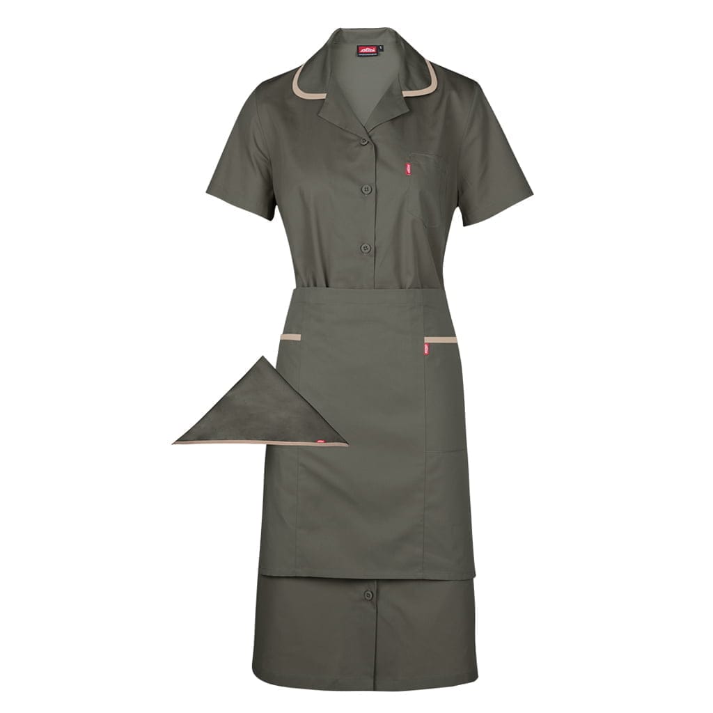 Conjunto de limpeza coordenado com vestido, avental e lenço de cabeça. Apresenta acabamento contrastante, avental graduado e vários bolsos funcionais para maior conveniência.
